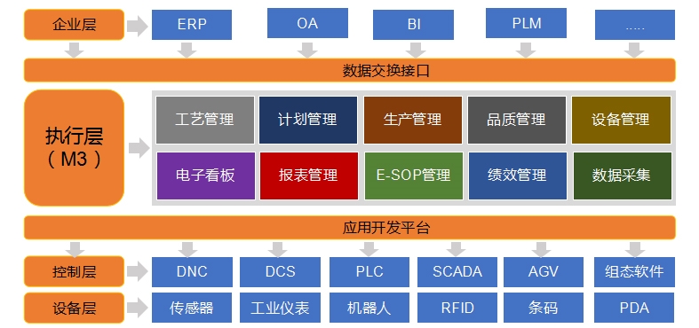 业务功能层包含工艺建模、生产管理、品质管理、设备管理、报表看板、数据采集业务功能;实现MES辅助管理生产现场,进行业务操作及结果展现。